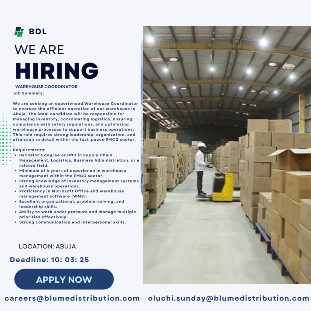 BDL is hiring an experienced Warehouse Coordinator to oversee daily warehouse operations in Abuja. The role focuses on inventory control, logistics coordination, safety compliance, and process optimization within a fast-paced FMCG environment.